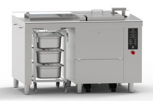 - В комплект входит тележка для трех гастроемкостей GN 1/1 с поворотными колесами, что облегчает выгрузку готовых продуктов.