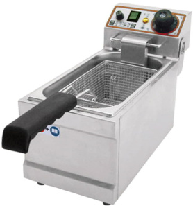 Фритюрница с одной ванной, вместимостью 4 л, изготовленной из нержавеющей стали. Ванна имеет отличную прочность и долговечность, а также, благодаря скругленным углам, ее очень легко чистить. Ванна аппарата рассчитана на использование одной корзины со следующими габаритами (мм): 130 (ширина), 220 (глубина), 100 (высота). Корзина имеет удобную ручку, выполненную из термостойкого материала. Фритюрница отличается компактностью и быстродействием. Мощность данной модели составляет 2 кВт.