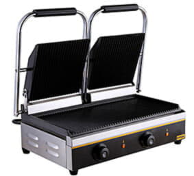 Пресс-гриль электрический, настольный, двойной (средний), рифленые рабочие поверхности из чугуна с антипригарным покрытием, размеры верхних поверхностей 215х215х20 мм, рабочая температура 50-300оС, материал корпуса - нерж.сталь