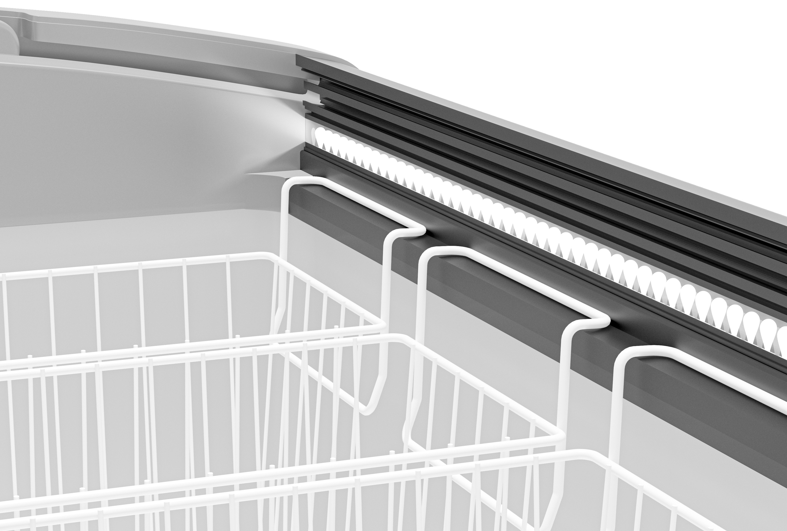 Для персонализации устройства можно выбрать контрастный цвет боковин или нанести рекламные наклейки по вашему дизайну. В комплекте с ларем поставляются пять корзин, которые обеспечивают удобную выкладку товаров.