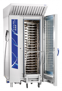 Пароконвектомат оснащен вентилируемой дверцей с двойным термостойким остеклением, что минимизирует риск ожогов. Внутреннее стекло дверцы открывается, что упрощает процесс очистки и предотвращает образование конденсата. Дверь имеет двухходовой механизм открывания для безопасности персонала, а замок работает по принципу "свободные руки", что позволяет закрывать дверцу одним движением.
