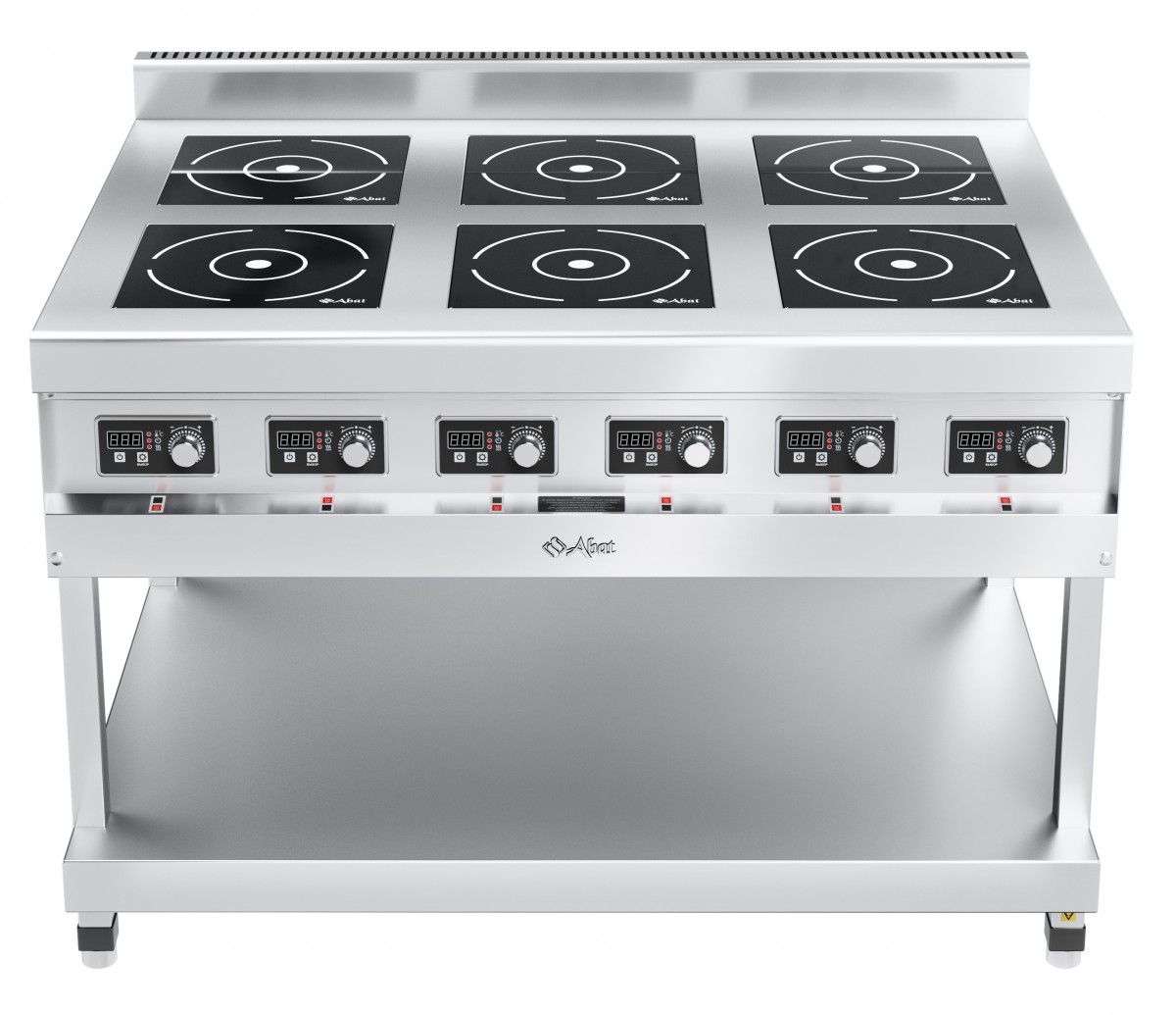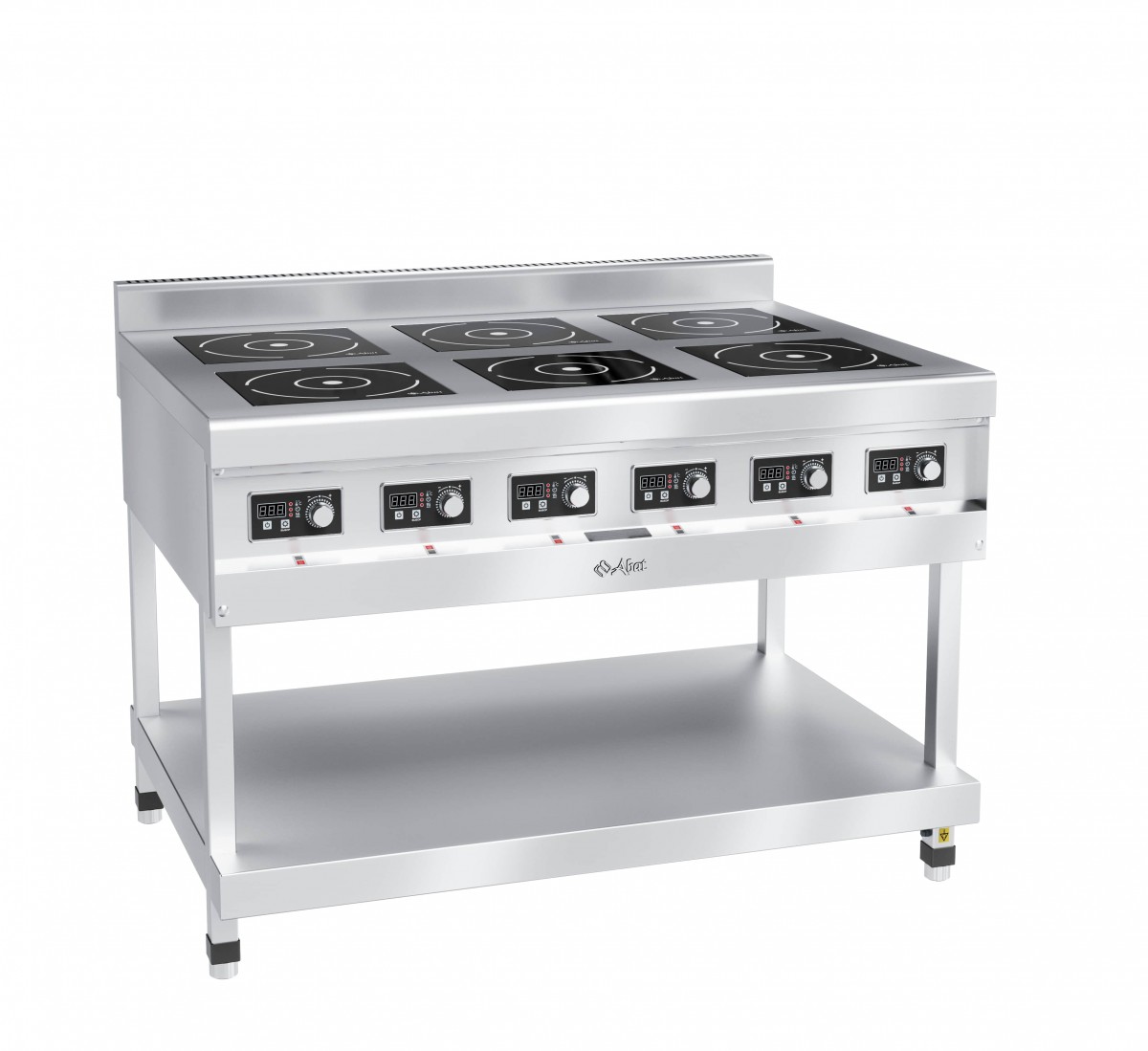 - Шесть индукционных конфорок, каждая из которых имеет мощность 3,5 кВт, что в сумме дает общую мощность плиты 21 кВт.