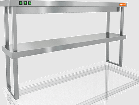 Габариты полки составляют 1500 мм в ширину, 300 мм в глубину и 800 мм в высоту, что делает её компактной и удобной для размещения на кухне или в ресторане. Верхний уровень полки оснащён подогревом, что позволяет поддерживать блюда в теплом состоянии, в то время как нижний ярус остаётся нейтральным, предоставляя дополнительное пространство для размещения посуды или ингредиентов.