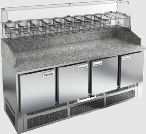 Холодильный агрегат расположен в нижней части конструкции, что способствует оптимальному распределению холода. Столешница выполнена из прочного гранита, а корпус изготовлен из нержавеющей стали, что гарантирует долговечность и легкость в уходе. Устройство оснащено динамической системой охлаждения и автоматической оттайкой, что упрощает эксплуатацию.