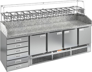 Объем данного устройства составляет 505 литров, что делает его идеальным для интенсивного использования. Холодильный агрегат расположен в нижней части конструкции, что способствует эффективному распределению холода. Столешница выполнена из гранита, а корпус изготовлен из нержавеющей стали, что гарантирует долговечность и легкость в уходе.