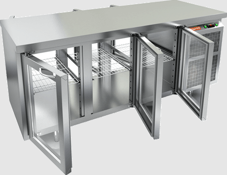 Электронная панель управления позволяет легко настраивать параметры работы, а три полки размером 330х325 мм обеспечивают дополнительное пространство для хранения. Столешница имеет толщину 50 мм и также выполнена из нержавеющей стали, что делает ее устойчивой к механическим повреждениям. Регулируемые по высоте ножки и автоматические доводчики дверей с фиксатором открытого положения добавляют удобства в эксплуатации. Легкозаменяемые магнитные уплотнители обеспечивают герметичность и эффективность работы устройства.