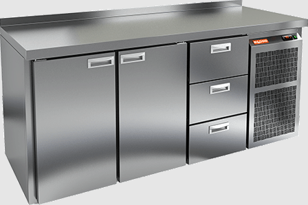 Холодильный агрегат расположен справа, что позволяет оптимально использовать пространство. Стол не имеет гастронормированных размеров, но оснащен бортиком для предотвращения случайного высыпания продуктов. Устройство работает от сети с напряжением 220 В и мощностью 600 Вт.