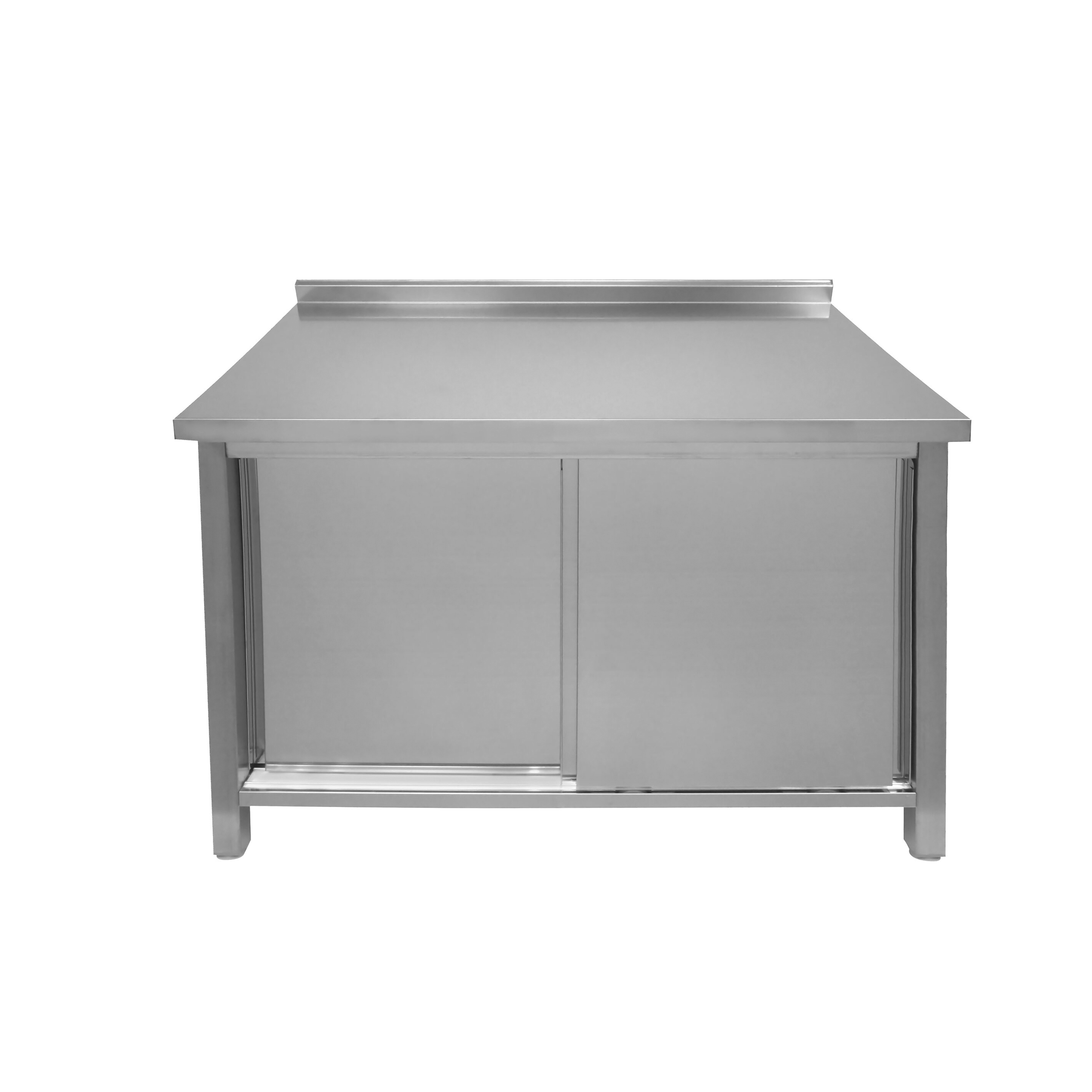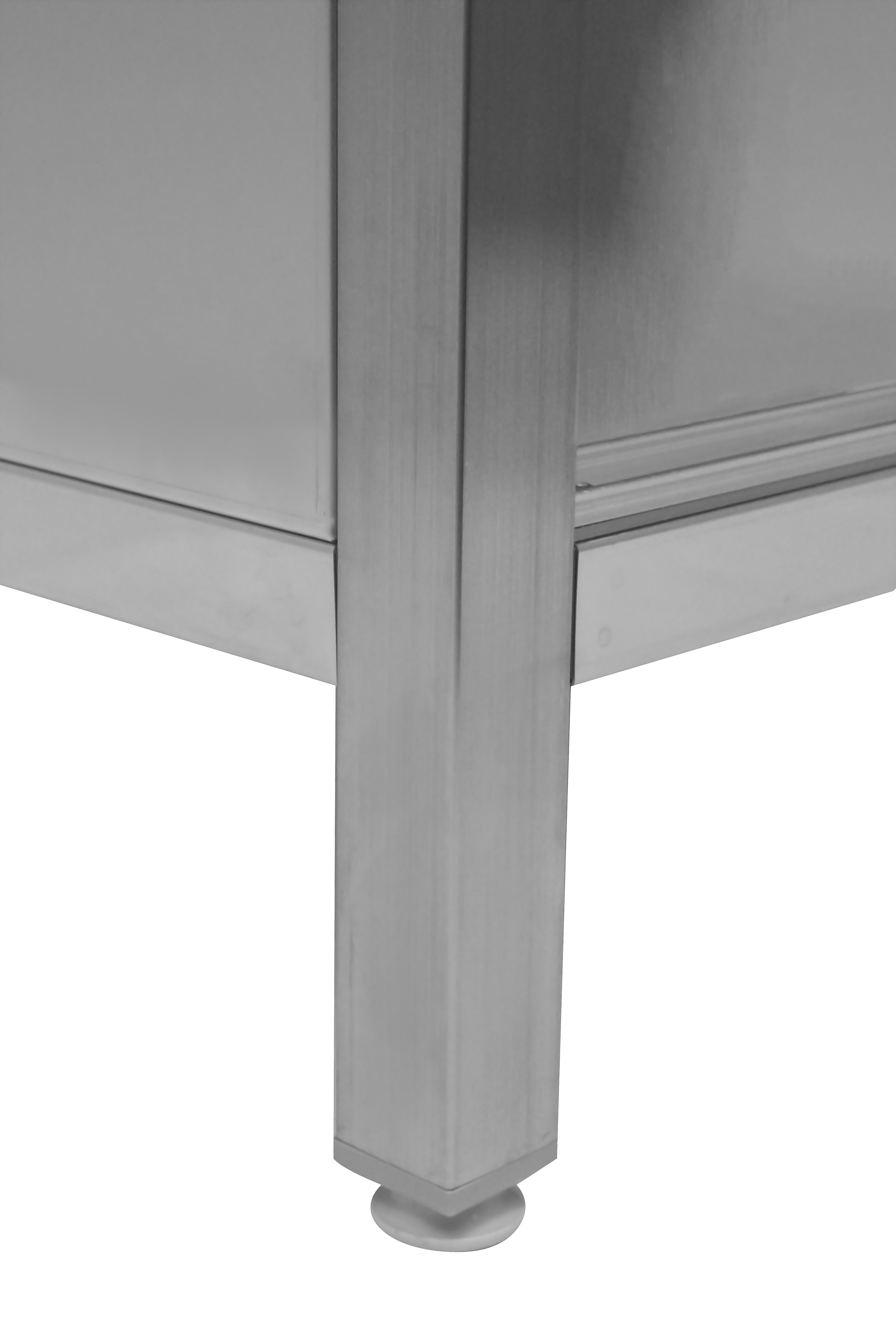 Борт стола позволяет устанавливать его вдоль стены, предотвращая попадание остатков пищи на пол и упрощая уборку. Сплошная полка и дно конструкции усилены ребром жесткости, что увеличивает полезное пространство для хранения посуды и продуктов. Ножки стола регулируются по высоте, что позволяет компенсировать неровности пола.