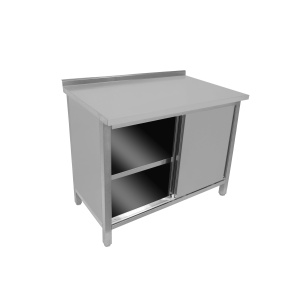Стол имеет прямоугольную столешницу с бортиком, выполненным из пищевой нержавеющей стали AISI 430, который укреплен с внутренней стороны листом древесно-стружечной плиты, что обеспечивает высокую прочность и предотвращает прогиб. Средняя полка и каркас изготовлены из крашеной или нержавеющей стали. Все кромки столешницы обработаны, а углы заварены и зашлифованы, что исключает риск травм при использовании и санитарной обработке.
