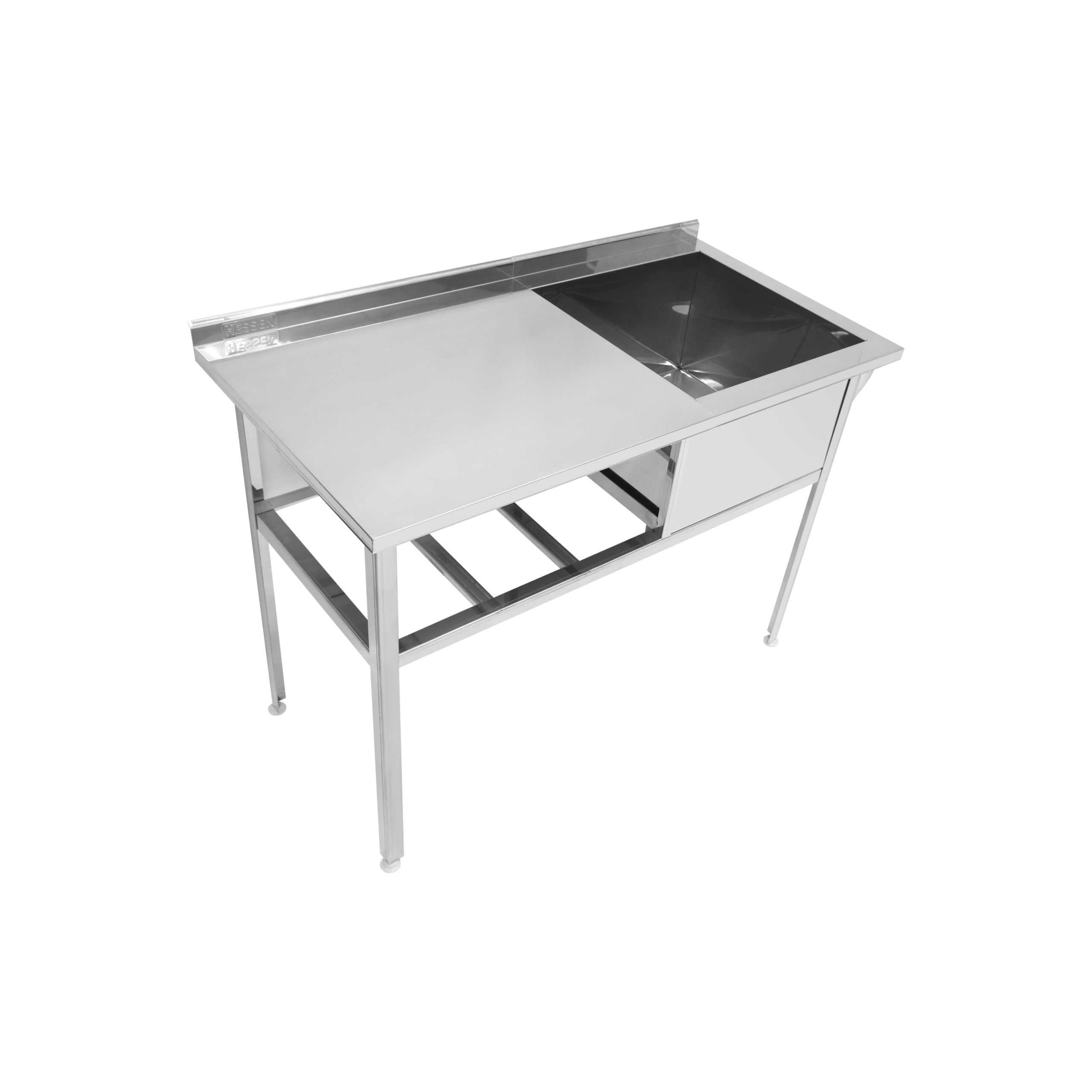 Изготовленная из высококачественной нержавеющей стали марки AISI430, ванна имеет глубину 300 мм и размеры 1150 мм в ширину, 600 мм в глубину и 870 мм в высоту. Конструкция включает в себя борт и полку, однако отверстие под смеситель отсутствует. Внутренние размеры секции составляют 480 мм в длину, 480 мм в ширину и 300 мм в глубину, а диаметр сливного отверстия равен 50 мм.
