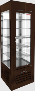 Изготовленная из крашеной стали, витрина имеет стильный коричневый цвет (RAL 8017), что делает её привлекательной для любого интерьера. Регулируемые по высоте ножки и светодиодная подсветка добавляют функциональности и эстетики. Однокамерный стеклопакет и легкозаменяемые магнитные уплотнители обеспечивают отличную теплоизоляцию.