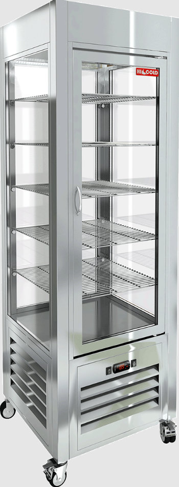 Изготовленная из нержавеющей стали, витрина отличается прочностью и долговечностью. Она также оснащена колесами со стопором для легкости перемещения и стабильности, а светодиодная подсветка придаёт дополнительный шарм. Однокамерный стеклопакет и легко заменяемые магнитные уплотнители обеспечивают отличную теплоизоляцию.