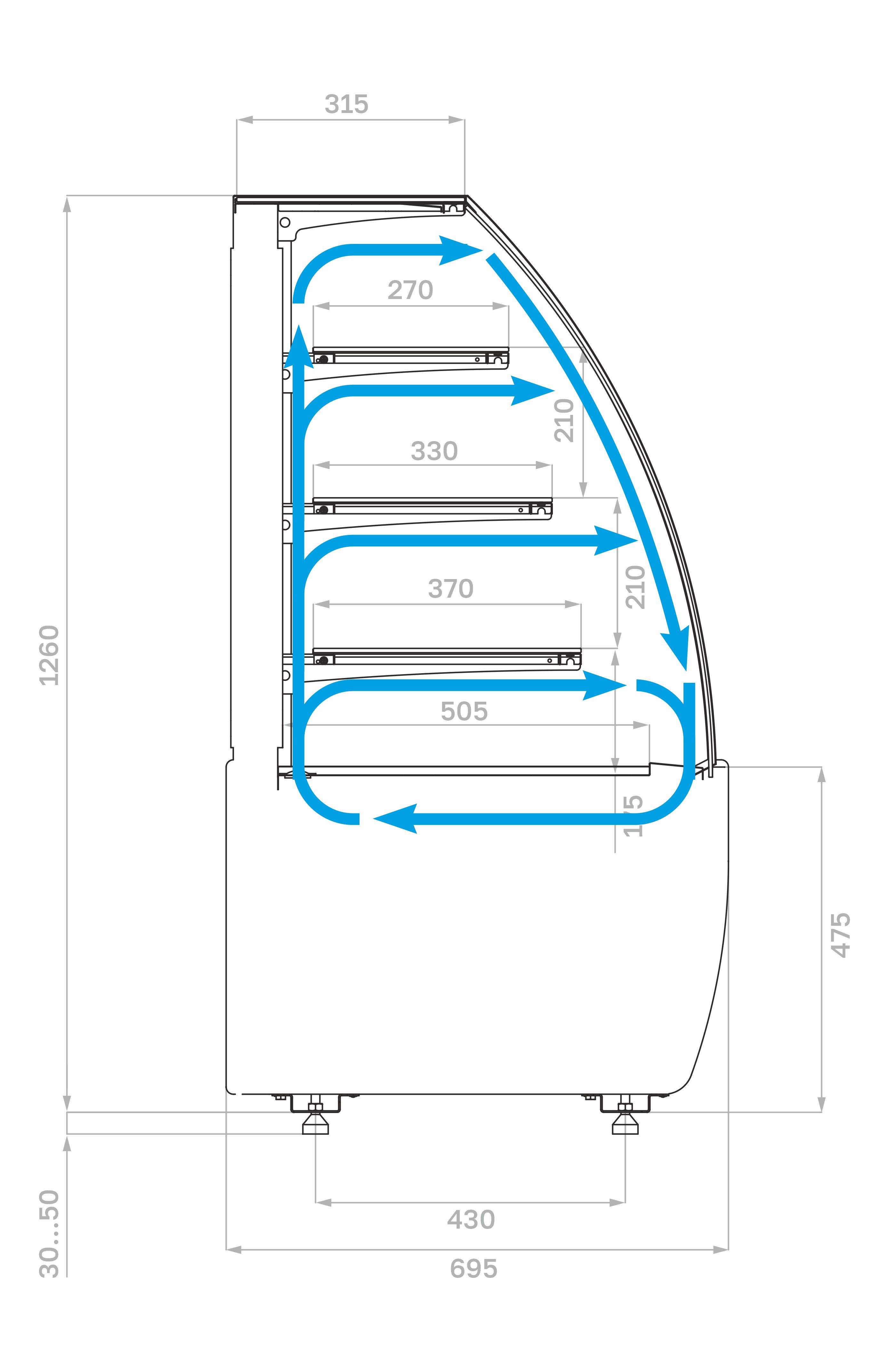 Витрина работает на основе динамического охлаждения и использует хладагенты R290 и R404a. Она предназначена для использования в помещениях с естественной вентиляцией при температуре окружающей среды от +12 до +25 градусов и относительной влажности не более 60%. Климатический класс оборудования – 3.