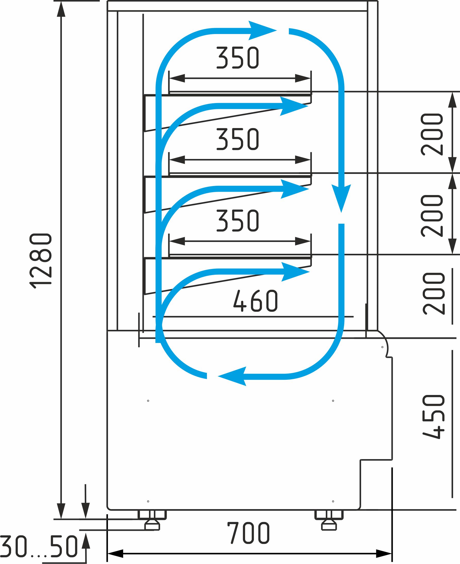 С габаритами 900 мм в ширину, 700 мм в глубину и 1330 мм в высоту, данная витрина имеет три полки, каждая из которых оснащена LED-подсветкой, что позволяет эффектно представлять кондитерские изделия. Максимальная нагрузка на стеклянную полку составляет 3 кг на погонный метр, что обеспечивает надежность и безопасность при эксплуатации.