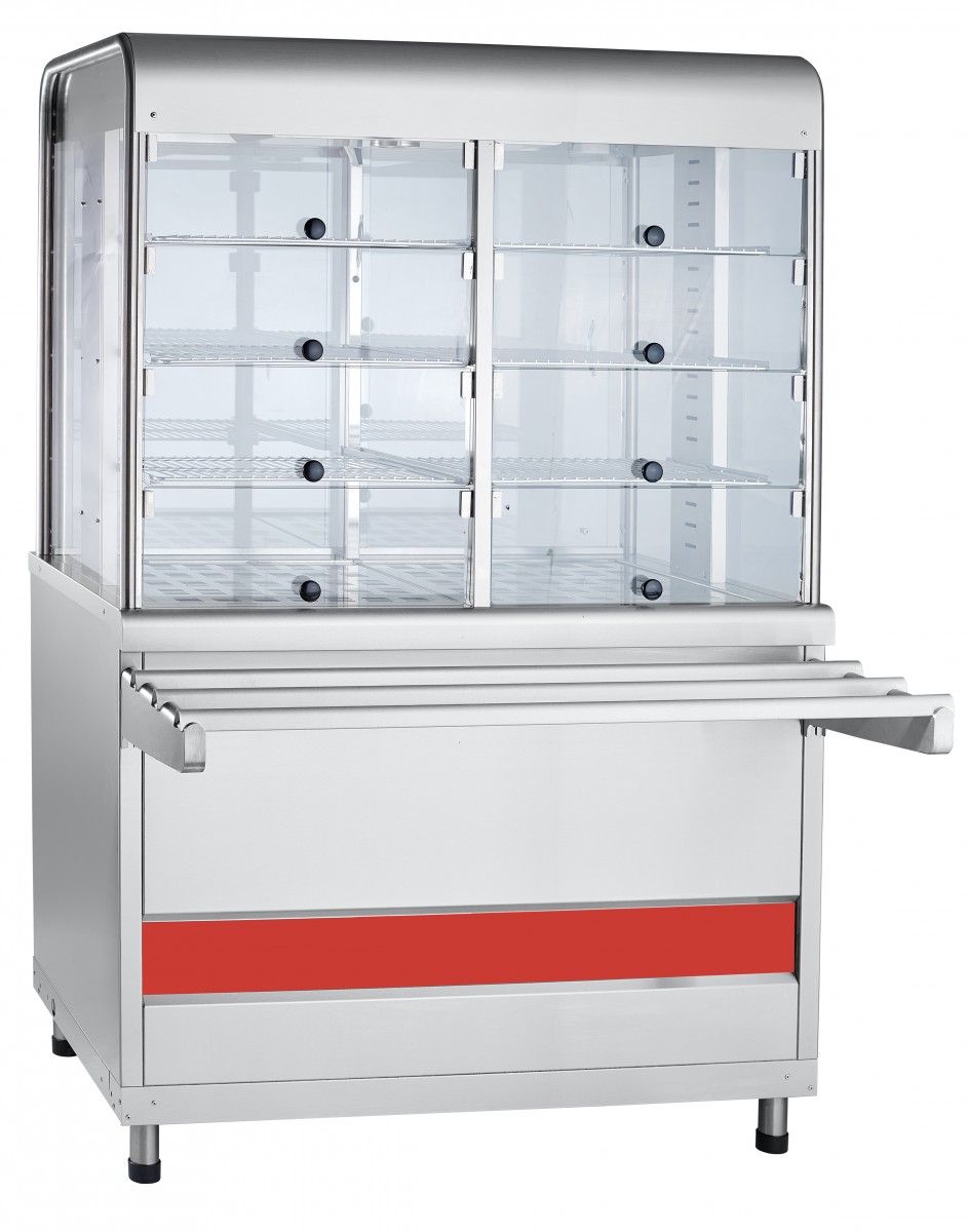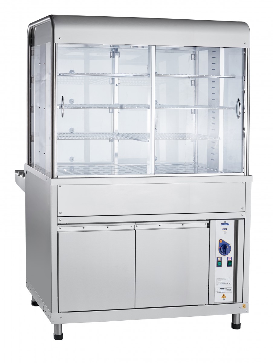 Витрина оснащена тремя рядами полок, что позволяет удобно размещать разнообразные блюда и напитки. Нейтральный шкаф с дверцами предоставляет дополнительное пространство для хранения инвентаря. Энергоэффективная LED-подсветка создает ровный и комфортный свет, не вызывая пульсации, что делает витрину идеальной для использования в общественном питании.
